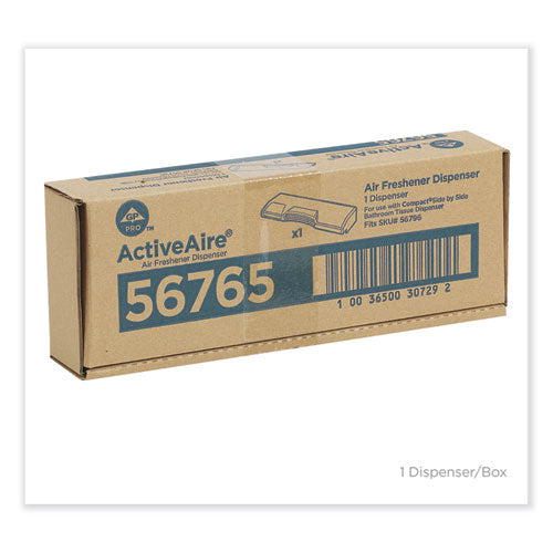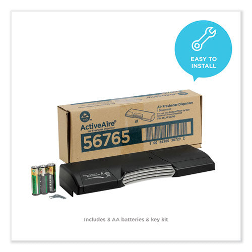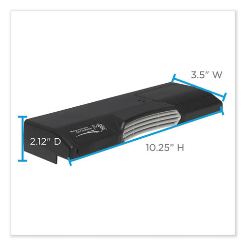 30 days of freshness with our sustained scent release air freshener. Designed to be mounted atop the Compact® Side-By-Side Bath Tissue Dispenser (sold separately). State-of-the art odor management system uses motion-sensing technology to automatically neutralize odor, releasing a burst of freshness upon entering and leaving the stall, with an on-demand feature that can be activated with the wave of a hand if a visitor needs a little extra burst of freshness. Single-key design makes it easy to refill Deodorizer and Bath Tissue at the same time, while providing additional security to help reduce the risk of vandalism or theft. Uses three AA batteries. ActiveAire® Air Care Systems elevate the restroom experience with coordinating scents in the stall, on the wall and at the urinal providing consistent, pleasant fragrance throughout the restroom. Designed for use in offices, restaurants, healthcare, industrial and educational facilities, ActiveAire® products help you minimize customer complaints while showing customers that you care. GP PRO is a division of Georgia-Pacific Consumer Products. We deliver well-designed, durable and easy-to-maintain professional solutions to meet the handwashing and cleaning needs for a range of business applications. Material(s): Plastic; Color(s): Black; Height: 3.75"; Width: 10.63".