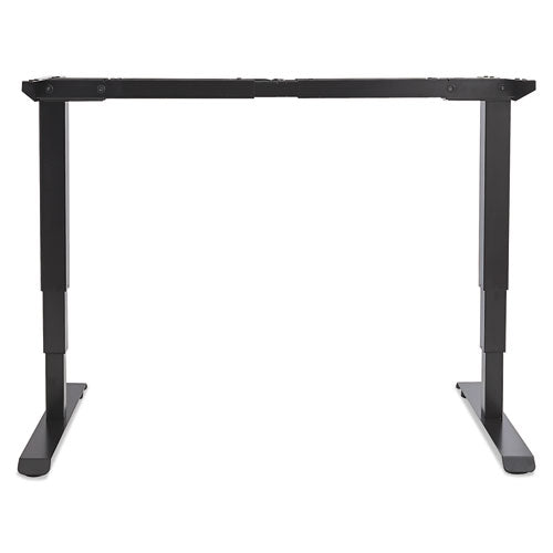 Set the perfect height when sitting or standing. Three-stage reversed-telescoping electric height-adjustable table base with four-memory presets and up and down controls. Quick setup with fold-out legs requires minimal assembly. Durable base with 285-lb. lift capacity moves within a 25" range from 25" to 50" (not including worksurface). Attaches to most common worksurfaces ranging from 48" to 75" width; and 24" to 36" depth. Integrated cable management channels; includes 9.8 ft power cord. Dual motors with movement up to 1.5 inches per second depending on load. Strong powder coated steel frame with cross bars provides stability and prevents racking. Adjustable leveling glides to compensate for uneven floors. Base Color: Black; Overall Width: 48" to 72"; Overall Depth: 24" to 36"; Height Minimum: 25".