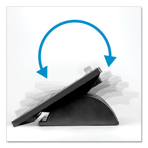 The Fellowes® Office Suites™ Adjustable Footrest supports your feet to help prevent back and leg discomfort and features new and improved Microban® antimicrobial protection to keep product cleaner. Tilt adjusts 30 degrees forward or back while the height adjusts to 4.13", 4.88", or 5.63". The locking mechanism either holds the footrest in preferred position or allows you to rock back and forth to encourage lower leg movement. No bending or stooping—footrest adjusts using only foot pressure. Width: 17.5"; Height: 4.13" to 5.63"; Depth: 13.13"; Color(s): Black/Silver.