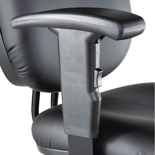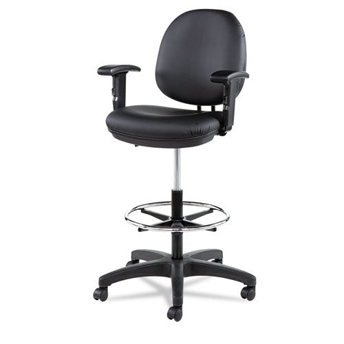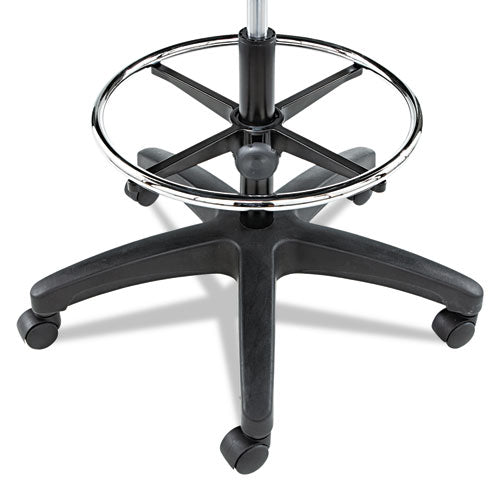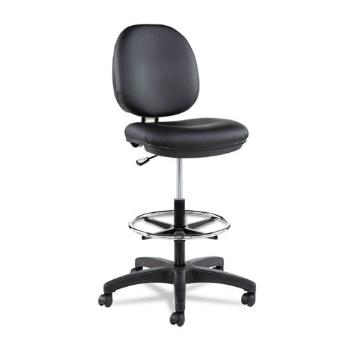 Molded plastic shell resists impact. Waterfall seat edge helps relieve pressure points on the underside of legs. Adjustable footring for optimal feet positioning. Five-star base with casters for easy mobility. Optional arms sold separately. Recommended Applications: Drafting, Warehouse & Industrial—Stools; Seat Color: Black; Back Color: Black; Color Family: Black.