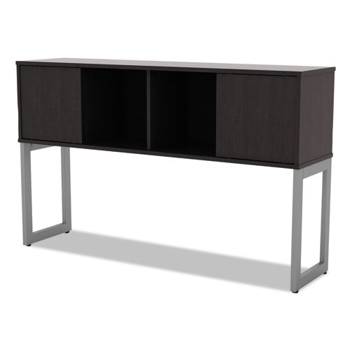 Increase productivity and deskspace with this overhead storage hutch. Sliding doors keep items easily within reach. Included doors can be omitted for even easier access. Contemporary open-plan office design. Commercial-grade woodgrain laminate is scatch-, dent-, and spill-resistant. Includes mounting tape and hardware. Color: Espresso; Color Family: Brown; Overall Width: 59"; Overall Depth: 15".