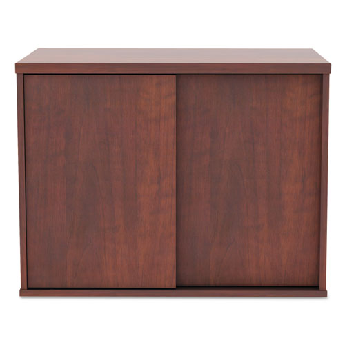 Sturdy low profile cabinet for storage or as a low credenza with your desk. These low credenza cabinets are great used as a return to expand your desk space to create "L" or "U" shaped desk configurations. Coordinating laminates for use with Alera® Valencia, Sedina, or Open Office Desk Series. Sliding doors are removable for open storage. Durable woodgrain laminate is scratch-, dent-, and water-resistant. Add a coordinated cushion top to expand your seating space with Alera® Credenza Cushions. Leveling glides compensate for uneven floors. Color: Medium Cherry; Overall Width: 29.5"; Overall Depth: 19.13"; Overall Height: 22.78".