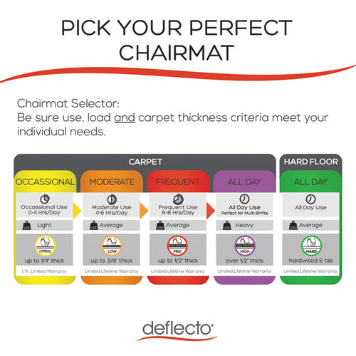Non-studded design protects hard floor surfaces from caster wear, spills and heavy traffic. Ideal for use on wood, tile, laminate and other hard floors (Not suitable for use on concrete floors). Non-orthophthalate, non-cadmium formula promotes a healthy work environment. Classic straight edge finish. Mat Type: Chair Mat; Application: Hard Floors; Width: 46"; Length: 60".