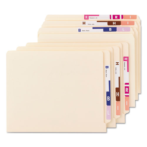 Self-adhesive labels center-creased to wrap around folder tabs. Includes dispenser box with printed dividers. Name Labels, First Letter and Combination Packages—Each label is printed for two alphabetic characters; simply strip away the letter not wanted. Type full surname or company name on label next to letter. Shape: Rectangular; Label Size - text: 1.16 x 3.13; Label Color(s): Assorted; Color Family: Multicolor.