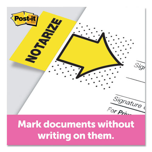 Post-it® 1" Wide Arrow Message Flags help you make sure that you don't miss anyone on your signatory list. Flags stick securely and remove cleanly without damaging your document. Included pack-style dispensers work great alone or can be incorporated into a larger desktop organization system. Color(s): Yellow; Color Family: Yellow; Message(s): NOTARIZE; Dispenser: Pop-Up.