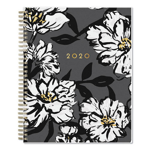Get ahead with this stunning black and gold floral planner in the "Baccara Dark" design! Use this CYO (Create Your Own) cover planner to stay on top of your everyday plans with fresh flair! The clear cover doubles as a storage pocket to keep track of loose papers, notes, and more. Additional clear interior pocket gives you extra storage. Planner also includes a Yearly Goals page, Contacts and Notes pages, Important Dates page, and four years of holidays. Twin-wire binding and durable, coated tabs offer easy page turning and access to past, present and future months. Thick premium pages reduce ink bleed-through. Includes six bonus past monthly views for easy yearly transitions (July - Dec). Monthly – Two-page-per month with Notes section. Size: 10 x 8; Page Color/Theme: Baccara Dark; Appointment Ruling: Open Scheduling; Edition Year: 2021.