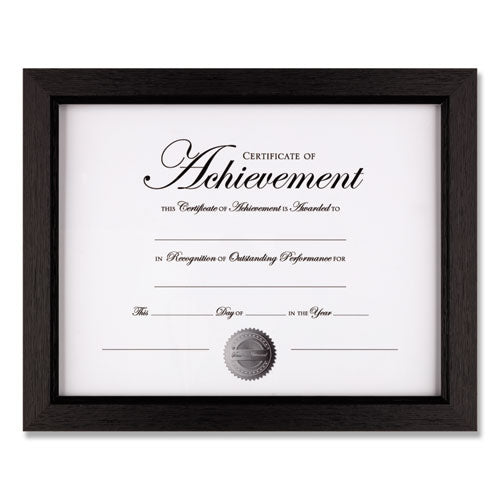 Document frame with wood grain texture finish is ideal for your office, home or studio. Includes usable certificate. Can be displayed vertically or horizontally. All sizes can be displayed on the wall. Includes two-way easel. Frame Type: Document; Frame Material: Plastic; Frame Color: Black; Height: 8.5".