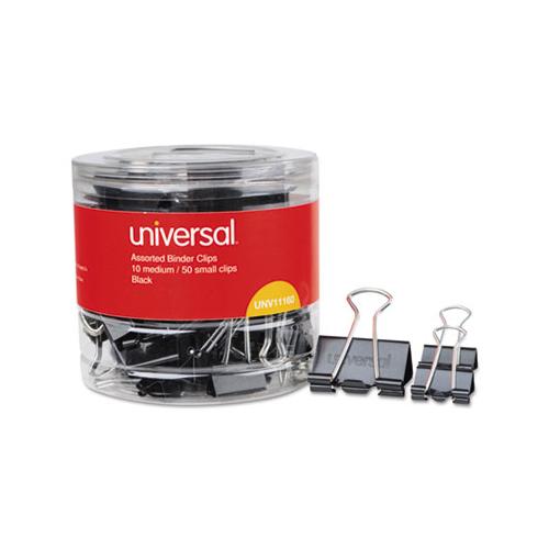 Ultra-efficient binder clips feature handles that can be hung, folded flat against clipped material, or removed for permanent binding. Efficient triangular design provides optimum strength and compression. Dispensing Tub. Clip/Clamp Type: Binder Clips; Clip/Clamp Type/Size Assortment: 50 Small (0.75"); 10 Medium (1.25"); Clip/Clamp Trade Size: Assorted; Clip/Clamp Material(s): Metal Clip/Steel Wire.