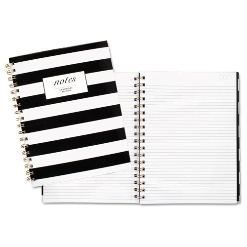 Durable hardcover notebook is designed for daily use, with classic black-and-white striped cover and gold accents. Ruled pages keep handwriting neatly aligned and include a date box for added convenience. Each page is perforated for clean and easy removal. Notebook is wirebound with gold twinwire binding to add style. The black-and-white striped notebook is bold and classy with a front cover that features the word “notes" stamped in gold along with the Cambridge® brand name. High quality white paper with black ruling meets all your notetaking needs. Book/Pad Binding Type: Twin Wire; Book/Pad Binding Edge: Side; Book/Pad Sheet Size: 9.5 x 7.25; Book/Pad Subjects/Sections: 1.
