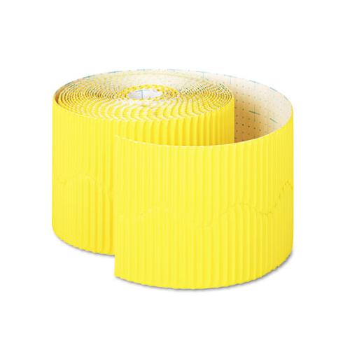 Dress up any bulletin or display board with this decorative border. Corrugated, scalloped design delivers the appearance of a fine framed edge. Rich, fade-resistant colors help enliven any environment. Color(s): Canary; Height: 2 1/4"; Length: 50 ft.