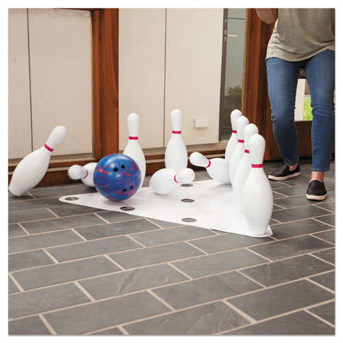 Lightweight ball and pins are easy for kids to move and set up. Rubber bowling ball knocks down pins outdoors, yet is still safe for indoor use. Pins are designed to last, even after hundreds of games. Includes one 4.5-lbs. blue/red rubber bowling ball and ten white plastic pins. Material(s): Plastic Pins; Rubber Ball; Playground/Gymnasium Sets Type: Bowling.