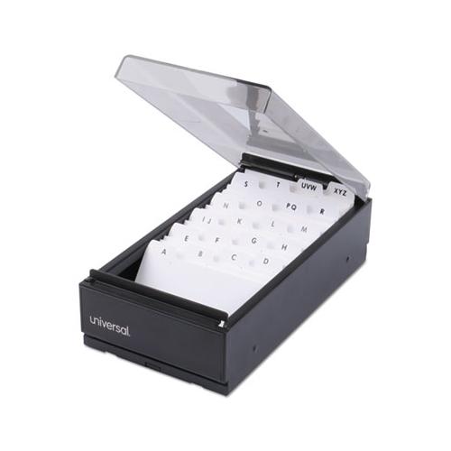Hinged lid opens easily and front panel tilts forward for easy access. Attractive metal file with translucent gray plastic top has generous capacity to manage a multitude of contact cards. Includes 20 A-Z guides to keep contacts organized. Card Holder Type: Covered Tray Business Card File; Card Capacity: 600; For Card Size: 2 x 3.5; Color(s): Black.