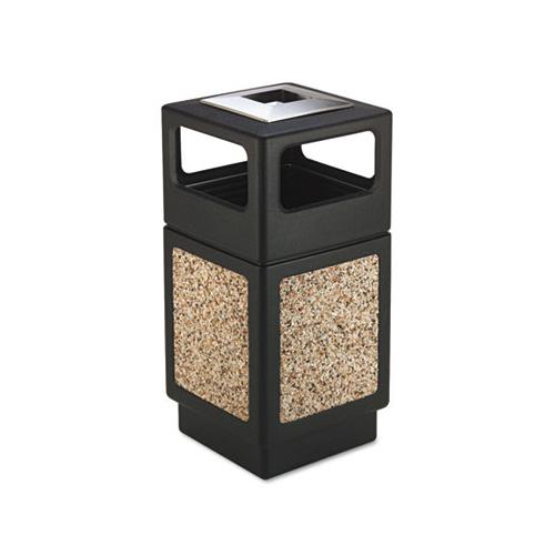 Molded stone aggregate for any first impression area with a recessed bottom. High-density polyethylene plastic will not chip or dent. UV inhibitors limit fading in sunlight. Adaptable for anchoring and weighting devices. Uses standard 32" x 44" trash bags and telescoping base hides bag. Ash Urn with Side Openings—12" sq. stainless steel ash urn built into lid. No sand required. Four 13" x 6" disposal openings. Waste Receptacle Type: Ashtray Waste Bin; Material(s): Polyethylene; Stainless Steel; Application: Outdoor All-Purpose Waste Disposal; Tobacco Product Waste Collection; Capacity (Volume): 38 gal.