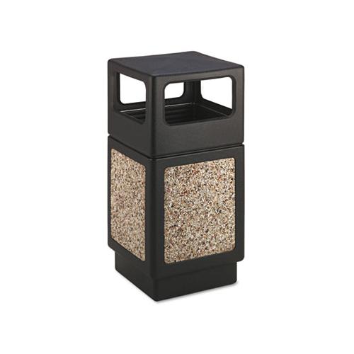 Molded stone aggregate for any first impression area with a recessed bottom. High-density polyethylene plastic will not chip or dent. UV inhibitors limit fading in sunlight. Adaptable for anchoring and weighting devices. Uses standard 32" x 44" trash bags and telescoping base hides bag. Side Opening Style—Four 13" x 6" disposal openings. Waste Receptacle Type: Indoor/Outdoor All-Purpose Waste Bin; Material(s): Polyethylene; Application: Indoor/Outdoor All-Purpose Waste Disposal; Capacity (Volume): 38 gal.