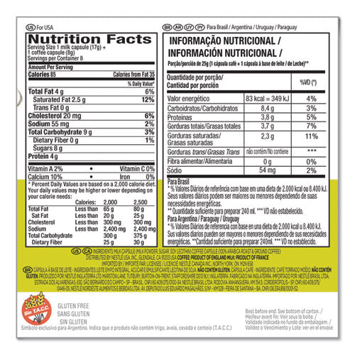 Create professional quality specialty beverages, coffees and espresso with a rich velvety cream thanks to the machine's high pressure. Hermetically sealed capsules, for a rich and aromatic cup every time. Simply pop in the capsule and brew. Beverage Type: Coffee; Flavor: Cappuccino; Packing Type: Capsule; For Use With: NESCAFÉ® Dolce Gusto® Machines.