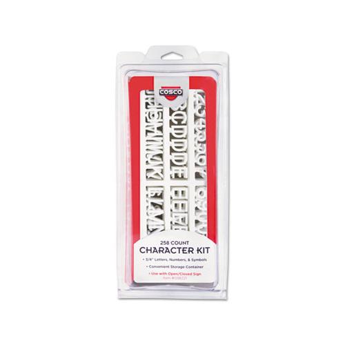Additional letters for use with Cosco® Message/Business Hours Sign COS098221 (sold separately). Includes 258 characters (A-Z, 0-9, $, ¢, /, @, ,, ., &, -, £, and www). Packaging also functions as a convenient storage container. Character Types: Letters; Numbers; Symbols; Character Style: Helvetica; Character Color: White; Material(s): Plastic.