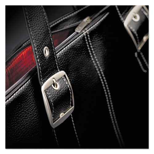 Fully padded 15.6" laptop compartment. Top zippered closure. Interior organizer section with key clip. Stylish interior lining. Rear pocket. Metal feet protect bottom of bag. Adjustable shoulder straps. For Use With: Laptops; Color(s): Black/Red; Color Family: Black; Material(s): Vinyl.