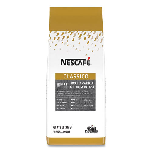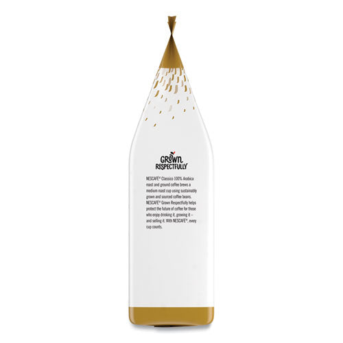 Nescafé® Classico 100% Arabica Roast & Ground Coffee brews a perfect cup of rich, medium-blend coffee with caramel notes and a hint of fruity undertones. Beverage Type: Coffee; Flavor: Classico 100% Arabica; Roast Type: Medium; Packing Type: Bag.