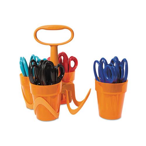 Includes a compact, sturdy carrier with four removable cups containing 24 pairs of scissors in four vibrant colors, plus a convenient carrying caddy. Cutting Tool Style: Children/Students; Tip Type: Rounded; Cut Length: 1.6"; Overall Length: 5".