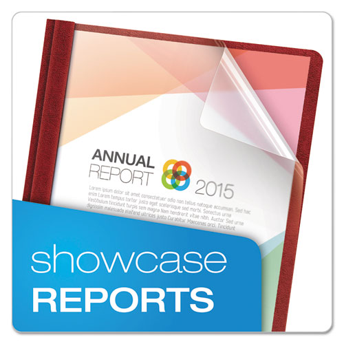 Full view of title page clearly grabs attention. Pacific-grade coated stock with embossed grain keeps reports looking good. Front Cover Color(s): Clear; Color Family: Clear; Back Cover Color(s): Red; Sheet Size: 8.5 x 11.
