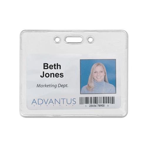 Badge ID holders keep valuable, high-tech proximity cards safe and clean. Thread a strap clip or neck chain adapter through to lock in place. Orientation: Horizontal; Name Badge Holder Length: 3"; Name Badge Holder Width: 3.75"; Name Badge Holder Color(s): Clear.