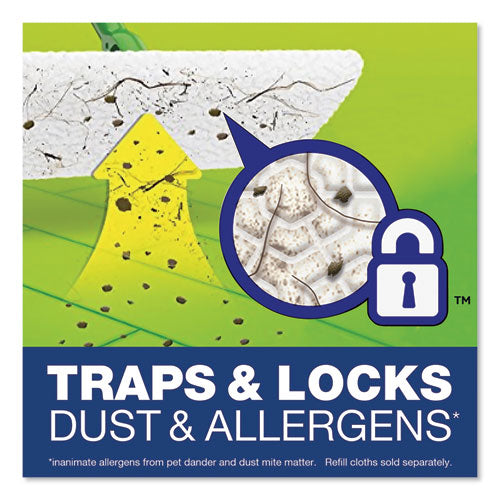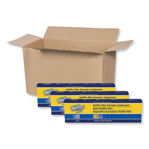 Removes dust, dirt, hair and allergens from finished floors. Use with disposable Swiffer® cloths (sold separately). Lightweight swivel head adjusts to get into hard-to-reach places. Use with dry or wet cloths. Mop handle breaks down into four parts for storage and to adjust length. Professional Max Sweeper—17" wide head provides more than twice the surface area of regular Swiffer® Sweeper®. Application: Floor Maintenance; Mop Head Size: 17" x 5"; Handle Length: 46"; Mop Head Color: White.